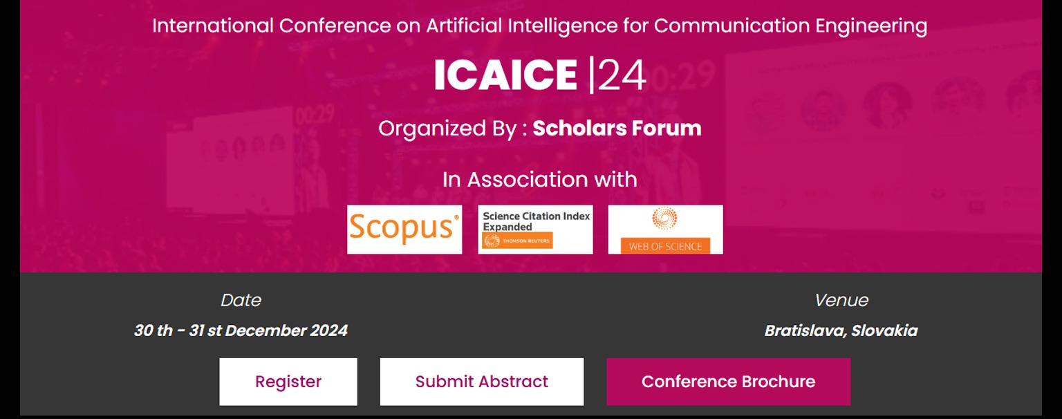 The systematic dissemination of the latest research findings and knowledge is crucial for the collective development of any discipline.The sole aim of ICAICE-24, which will go down on the 30 – 31  December 2024; in Bratislava, Slovakia, is to facilitate this exact thing for the benefit and advancement of Artificial Intelligence for Communication Engineering.